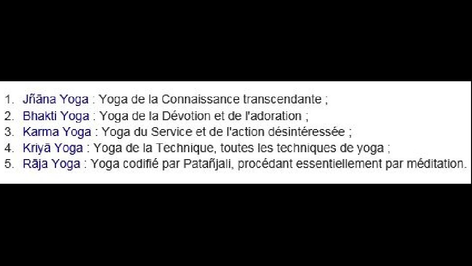 Les différentes écoles de Yoga Hatha Yoga – Kria Yoga – Kondalini Yoga Bikram Yoga – Ashtanca Yoga …. . Enseignent les respirations, les postures La philosophie, les sciences