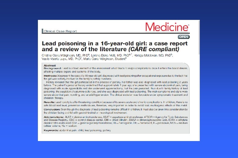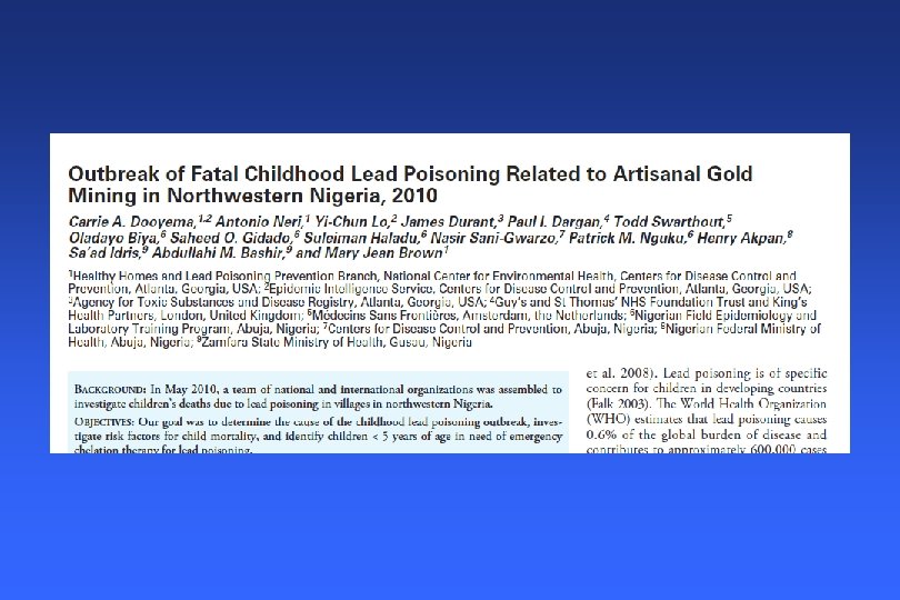 Lead poisoning today - 2 • Children: rare case reports of symptomatic plumbism – US: usually, lead paint exposure • Pica • House dust in home, soil – US: sometimes exotic source, eg, swallowed lead object – 3 rd world: above, + air/water/food, + occupational / home exposures