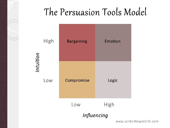 The Persuasion Tools Model �The Persuasion Tools Model (see Figure 1 below) is based on work by the psychologist Kenneth Berrien. In his studies of applied psychology in the 1940 s, he linked negotiation and persuasion style to emotional intelligence (EI). �The model can help you find the best negotiation approach to use, based on your level of intuition and your influencing capabilities. You can use the model to develop your influencing and persuasion skills, and become a better negotiator.