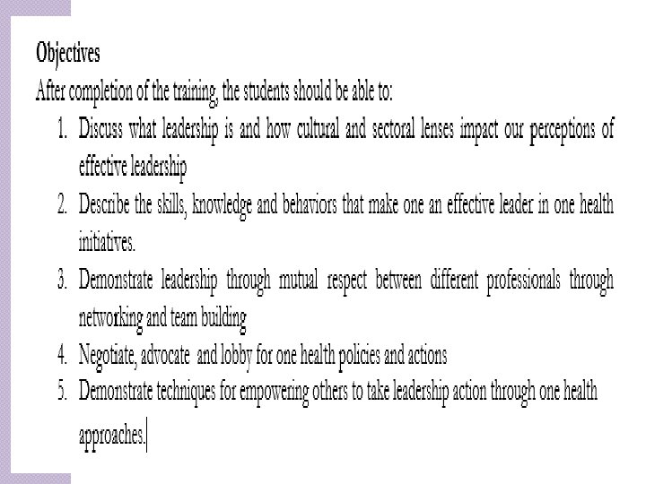 Goal �Graduate multidisciplinary teams capable of initiating a shared vision, create inspire and motivate teams across sectors and execute roles through team work and professionalism �One Health Leadership is inclusive and participatory �Capitalizes on ideas and skills of multidisciplinary teams �Considers teamwork, professionalism and emotional intelligence