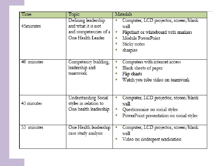 introduction �The management session will help participants to learn about necessary tools and skills that create effective One Health managers. � Leadership module will survey the range of leadership skills, knowledge and behaviors that One Health professionals must exhibit to be effective in their work.