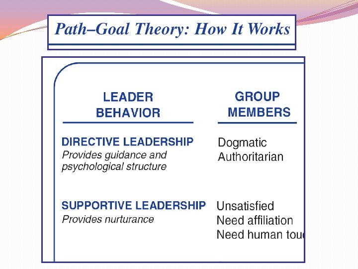 Path-Goal Theory Pros �Helps understand how leader behavior effects subordinates satisfaction and work performance �Deals directly with motivation – one of the only theories to address this �Provides a very practical model – make a clear path and follow it