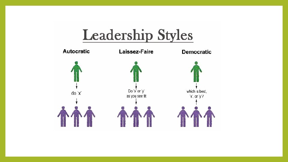 3 types of Leaders • Authoritarian(Autocratic): A leader that gives clear commands of what should be done and how it should be done without input from his followers • Democratic: A democratic leader offers guidance and asks for input from his/her followers. Not afraid to participate in the task. • Laissez-Faire: Offers little guidance or direction to followers but allows them to decide what is best for the group.