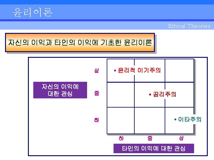 윤리이론 Ethical Theories Conduct 행위 • Teleological Theories, cont’d. 목적론 • Three different approaches to making decisions regarding moral conduct 윤리적 행위에 관한 결정을 내리는 세 가지 접근법 - Utilitarianism (create greatest good for greatest number) 공리주의 -- 최대 다수를 위해 최선이 되는 것을 창출함. Example: leader distributes scarce resources so as to minimize benefit to everyone, while hurting the fewest; preventive health care vs. catastrophic illnesses 예 : 예방적 건강관리 와 질병치료에서 리더는 피해를 최소화하면서 모든 사람들의 편익을 최대화 하기 위해 부족한 자원을 공급함. - Altruism (show concern for best interests of others) 이타주의 -- 타인의 최대 이익을 위해 관심을 보임. • Authentic transformational leadership is based on altruistic principles 순수한 변혁적 리더십은 이 같은 이타주의 원칙에 기초함. ▪ Example: the work of Mother Theresa, who gave her entire life to help the poor 예: 전 생애를 빈민을 돕는 데 바친 테레사 수녀의 업적