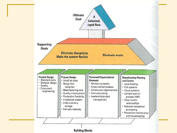 Supporting goals n n n A balanced system, smooth, rapid flow of materials and/or work To make a process time as short as possible Supporting goals: q q q Eliminate disruption Make the system flexible eliminate waste, especially exess inventory