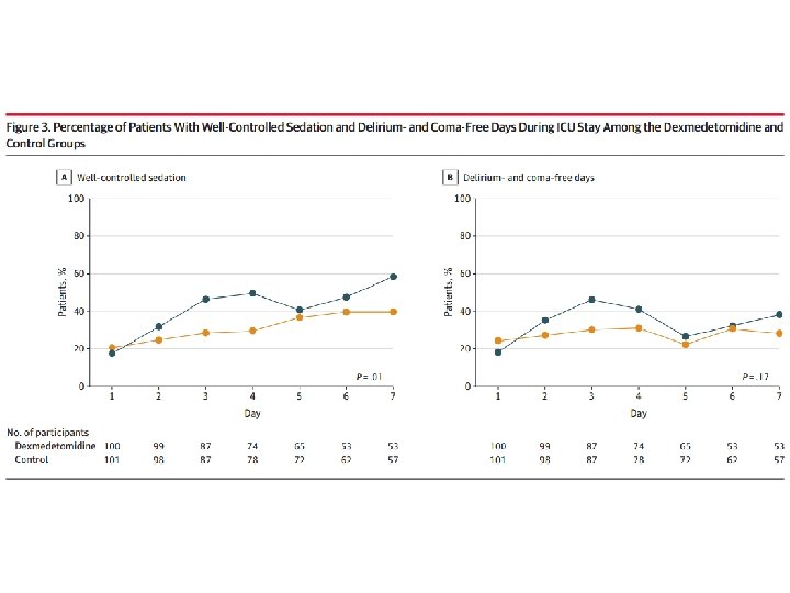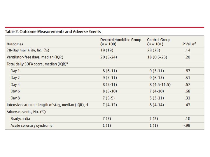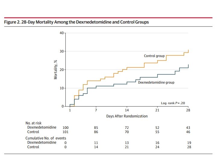 • The Maximizing Efficacy of Targeted Sedation and Reducing Neurological Dysfunction (MENDS) randomized clinical trial Dexmedetomidina apresentou uma taxa de mortalidade de 28 dias menor comparados com aqueles que receberam lorazepam.