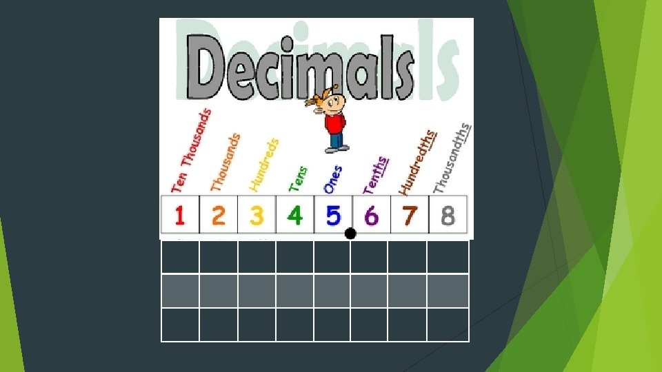 Key Terms Decimal – A number that has a digit in the tenths place, hundredths place, and beyond. Place Value – The value given to a digit by its position in a number. Value – The numerical worth or amount of a digit.