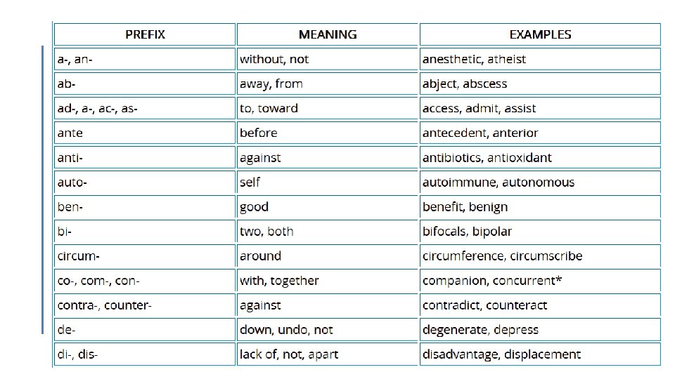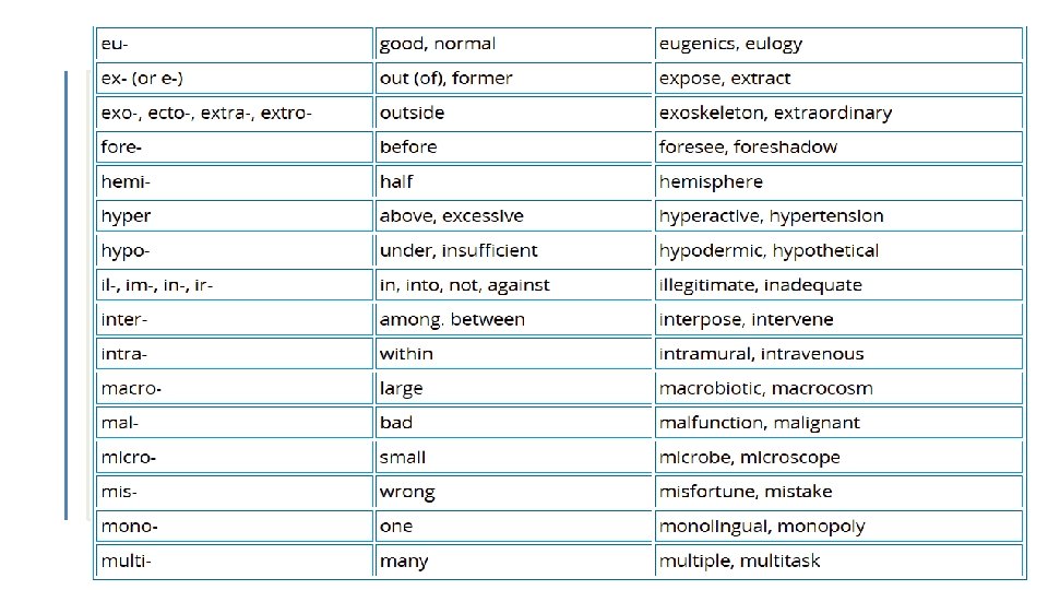 Prefixes are added to the beginning of a base word. They change the meaning of the base word. Un + happy = unhappy Re + do = redo