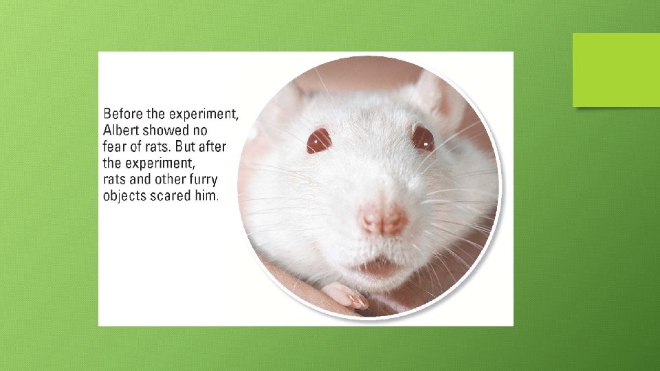 Case Study: The Little Albert Experiment The Little Albert experiment showed that emotional reactions such as fear can be taught through classical conditioning. The Experiment The Results • Eleven-month-old Albert was conditioned to fear a white rather than be amused by it. • Psychologists achieved this by pairing the rat with something that Albert would find instinctively frightening. • After they paired the rat with loud noises, Albert showed a fear of the rat even when there was no noise. • Albert’s fear spread to similar objects. • By today’s standards, the experiment was unethical.