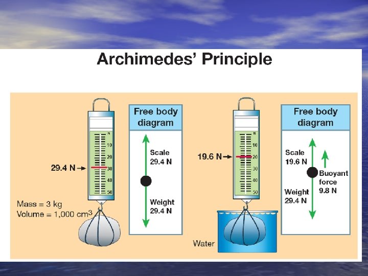 Archimedes’ Principal • In the third century • BC, a Greek mathematician named Archimedes realized that buoyant force is equal to the weight of fluid displaced by an object. A simple experiment can be done to measure the buoyant force on a rock with a spring scale when it is immersed in water.