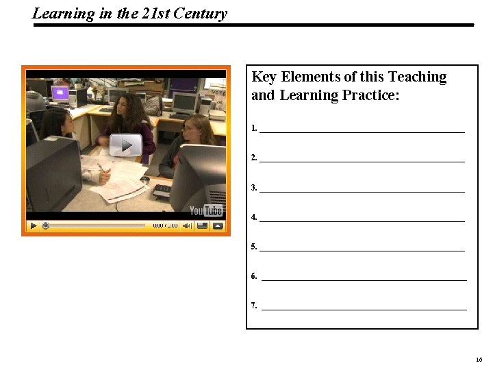 Learning in the 21 st Century 19 1083 _Macros Watch Video and List Key Elements of this Teaching and Learning Practice: 1. _________________________ 2. _________________________ 3. _________________________ 4. _________________________ 5. _________________________ 6. _________________________ 7. _________________________ 14