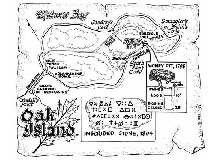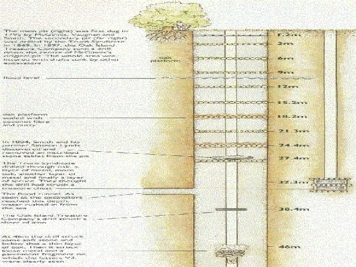 The Story Begins… • In 1795, 16 year old Daniel Mc. Ginnis discovered a strange clearance of trees on the island. The ground looked as though it had been dug up and then refilled. • With the help of friends, Daniel began to dig. After a few feet, they came to a layer of flat stones. • After much work they managed to remove the stones. However, after another ten feet they came to a layer of oak wood. There were some strange etchings on the logs which the boys could not understand. They abandoned their dig, but the story spread…