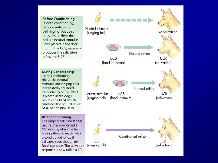 Conditioned (Learned) Stimulus — Bell Conditioned Stimulus = • The stimulus that was originally neutral becomes conditioned or learned after it has been paired repeatedly with the unconditioned stimulus • Will eventually cause the unconditioned response by itself – The Bell predicts food is coming so the dog salivates – What was once neutral is now learned/conditioned because it now causes something to happen. Before it did not.