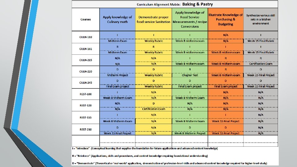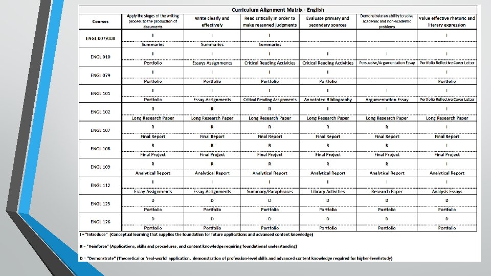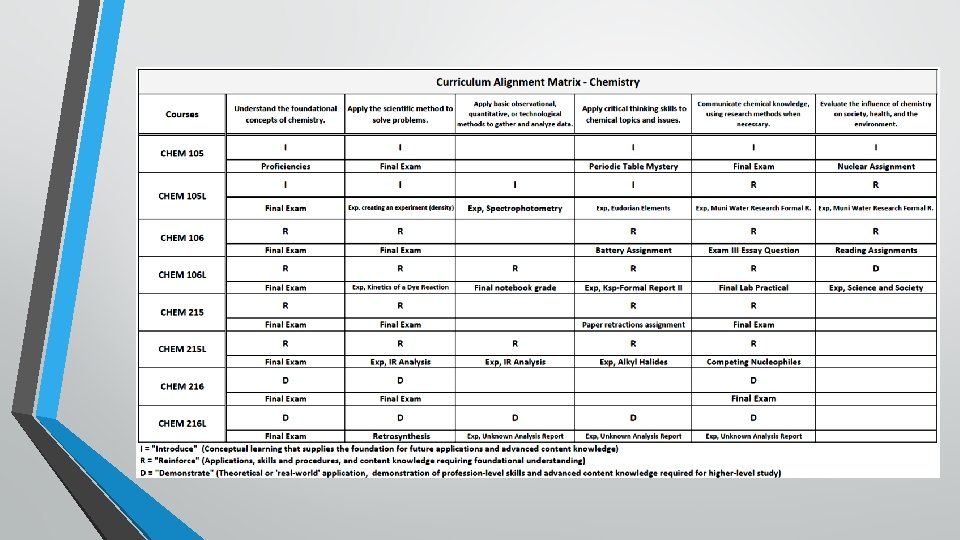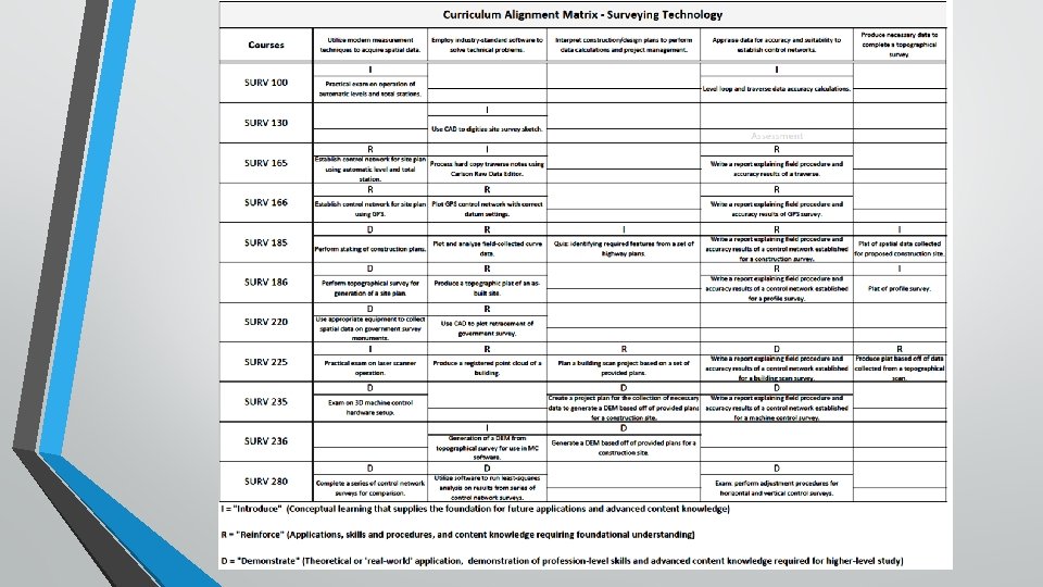 Mapping Objectives Across the Curriculum Alignment Matrix Courses PLO 1 PLO 2 PLO 3 PLO 4 PLO 5 PLO 6 Assessment Assessment Assessment Assessment Assessment Assessment Assessment Assessment Assessment Course 1 Course 2 Course 3 Course 4 Course 5 Course 6 • Curriculum mapping creates a matrix illustrating the connections among the objectives, courses, and assessments in the curriculum. Each objective is mapped to each course where it is addressed and indicates how it is assessed. For our purposes, objectives are Introduced (I), Reinforced (R), or Demonstrated (D). When an objective is Demonstrated (D), the students should be engaged with assignments that require they show they have mastered the skill or behavior to the degree and under the conditions specified in the project learning objective.