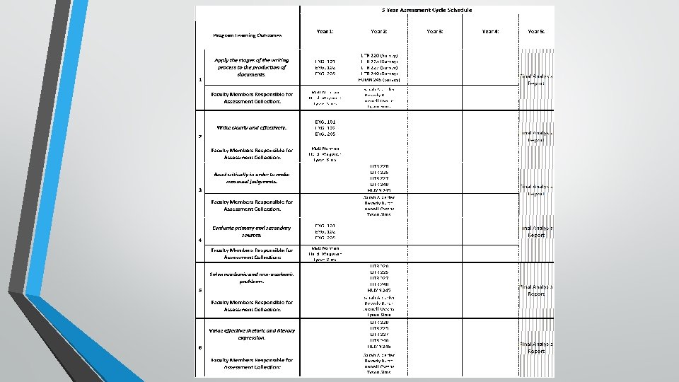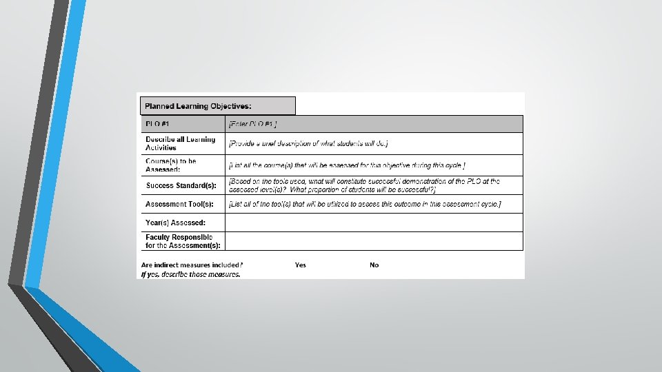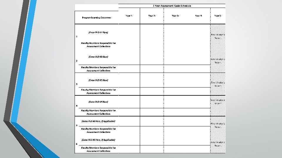 Assessment Planning and the Five-Year Cycle • • • 2 -Year Assessment Cycle All program learning objectives should be assessed every two years. • 5 -Year Program Cycle Program review utilizes a five-year cycle that includes two 2 -year cycles of assessing objectives, synthesizing four years of assessment findings. An objective must be directly assessed at least once in each two-year cycle but may be assessed more than once or in more than one way. • All assessments of objectives should plan for a direct assessment – direct demonstration of the objective by students that can be directly observed and evaluated by instructors. Thus, each program learning objective will be assessed at least twice before each program review. • During the fifth year of the cycle when a program is undergoing review, it should synthesize the data and findings of the past four years of objectives assessment—two full cycles. • No additional data will be collected in the fifth year; rather, that time will be spent preparing materials for the review and on program planning. • Plans can also utilize indirect measures – tools designed to seek students’ impressions of and feedback about their own learning and experiences. • Direct assessments are necessary; indirect assessments are supplementary.