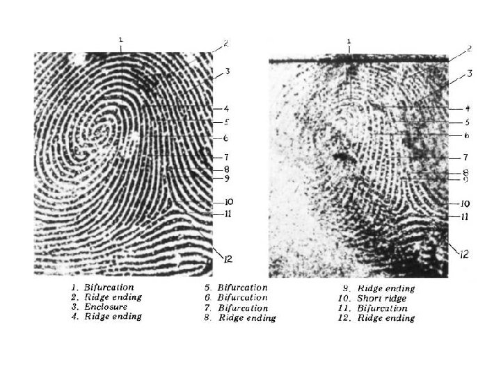 Basic Ridge Characteristics The major types are as follows: – Bifurcations: ridges that split into two ridges – Ending Ridge: a simple straight ridge – Dot: a simple dot – Island: a ridge that forks and forms a complete circle, and then becomes a single ridge again Dot Bifurcation Island Ridge Ending