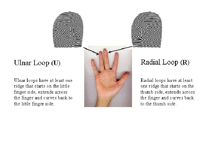 Review: Fingerprint Patterns • The major ridges in each finger form a pattern. • There are 3 major pattern types which can be subdivided into a total of 8 patterns: – Loops • Radial Loop • Ulnar Loop – Whorls • Plain Whorl • Double loop Whorl • Central Pocket Loop • Accidental Whorl – Arches • Plain Arch • Tented Arch