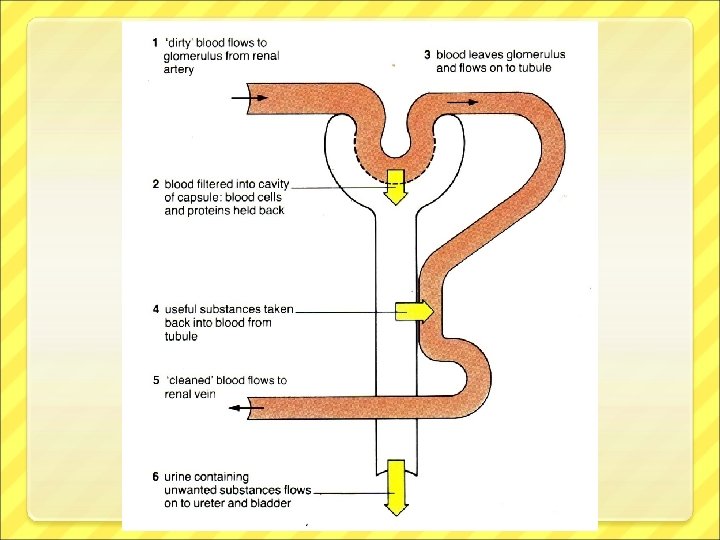 Blood contains useful + waste substances e. g. Glucose, urea, salts and water Kidney Tubule- Useful substances are reabsorbed back into the blood (glucose, some water and some salts) Blood capillary. Reabsorbs useful substances Blood is filtered and filtered substances enter the bowman’s capsule Filtrate enters Only waste substances remain- Urea, some salt, some water Blood leaving the kidney contains only useful substances (glucose, some water and some salt