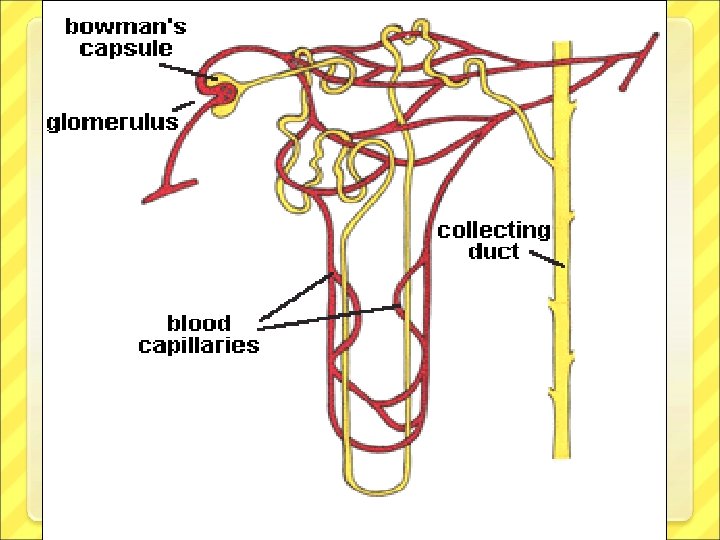 From renal artery Glomerulus Bowman’s capsule • Water • Glucose • Urea all filtered into Bowmans capsule and down into tubule GLUCOSE Proteins and reabsorbed. blood cells too big and remain in blood Tubule WATER reabsorbed. Collecting duct to renal vein URINE: Urea + excess water To the URETER