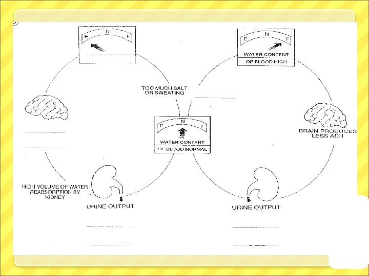 When the water concentration of the blood is too low, low a message is sent to the hypothalamus and ADH is released. This increases the volume of water reabsorbed. Think – ADH means Anti Drying out