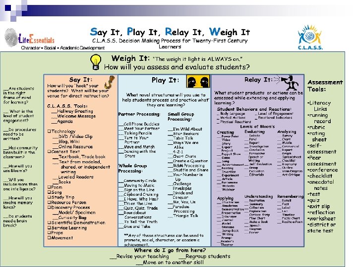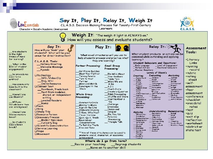 Agenda for Today n. What is C. L. A. S. S. and how does it it relate to students with disabilities? n. What’s Important about Brain Research and disabilities? n. Say it, Play it, Relay it, Weigh it n. Adaptations n. Memory and Understanding
