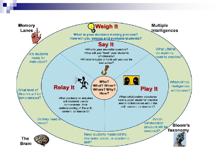 Brain Compatible Strategies n n n n Welcome Messages Agendas Hall Greetings Community Circles Behavior Procedures Life Goals Emotional Hook n n n Say it, Play it, Relay it, Weigh it Collaboration Structures Literacy Links Multiple Intelligences Memory Lane