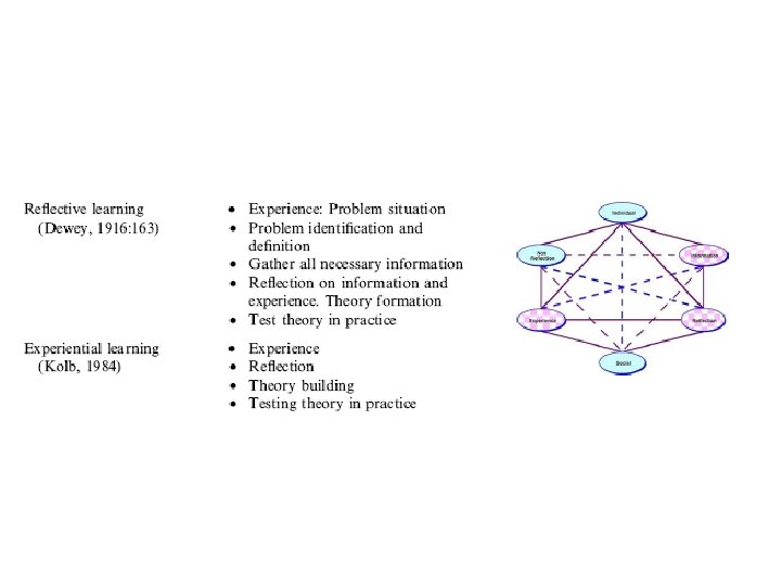 “Experiental learning” metaphor • The foundation of learning is experience. • Learning is the transformation of our experiences into knowledge, skills, attitudes, values • Reflection helps to transform the experiences. (Kolb)