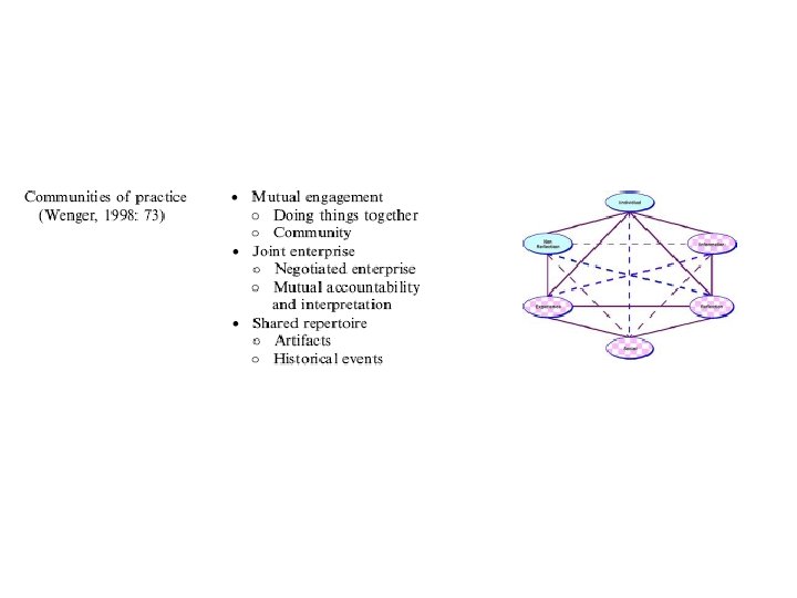 Community role in learning • The development of content alone does not lead to more effective learning and there is the need to structure and foster learning environments to enable communities to develop. • Learning happens through mediating artefacts within a framework of activity within a wider socio -cultural context of the rules of the community.