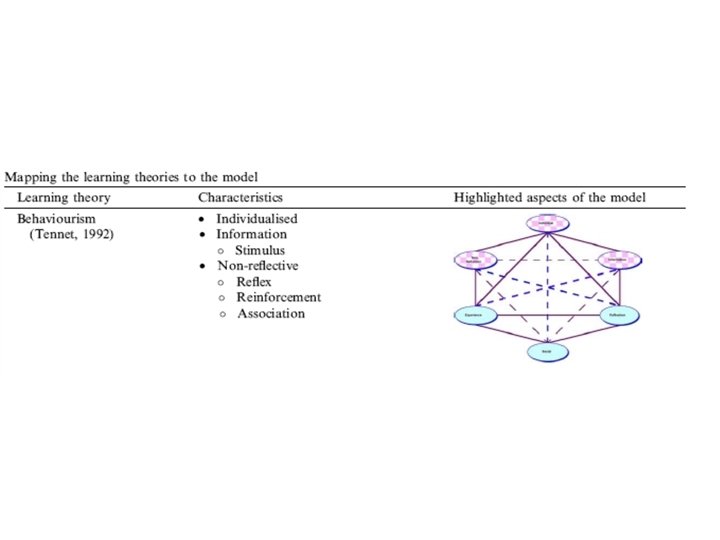 Linking learning theories with instructional design Oliver´s framework: The representation emphasises the relationships between the ends of the spectrum in the form of an octahedron: • Individual – Social. • Reflection – Non-reflection. • Information – Experience. The representation is useful in terms of helping to identify learning pathways