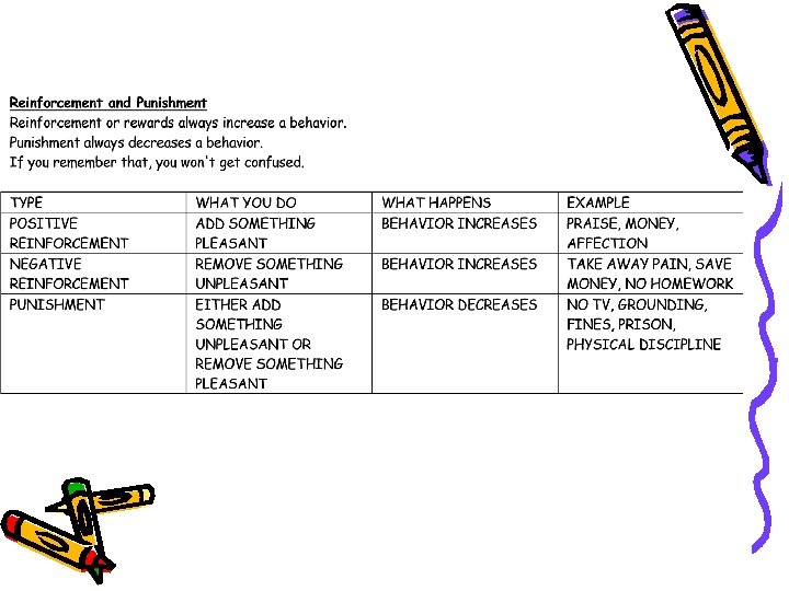 • Reinforcement: There are two types of reinforcers: – primary reinforcers – events that are inherently reinforcing because they satisfy biological needs (food, water, safety). These work especially well with animals but can also work with humans. – Secondary reinforcers – events that acquire reinforcing qualities by being associated with primary reinforcers (less tangible rewards such as praise, money, acceptance, affection) • The most effective reinforcements are attention getting and out of the ordinary.