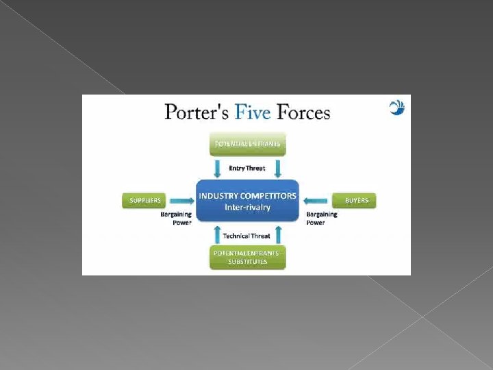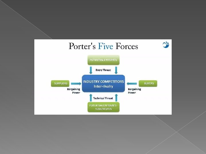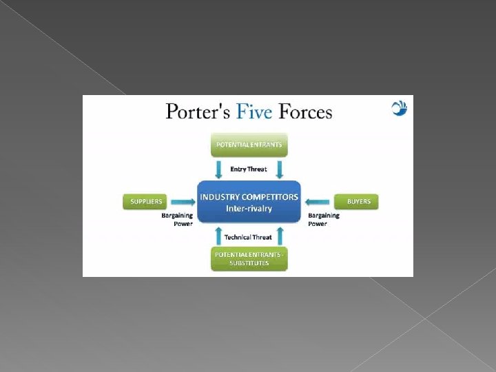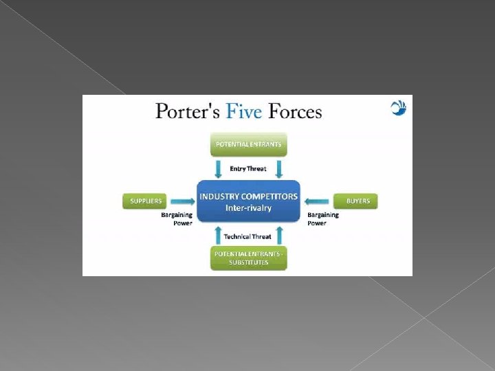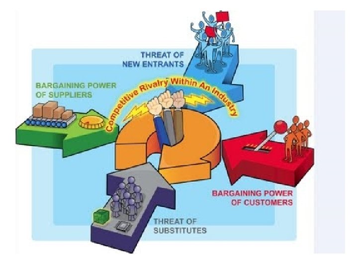 Porter’s 5 -Force Model �Forces impact market environment. �Explains structures of industry. �Different profit potential. � 5 Forces that determine industry structure: 1. Competitors 2. Customers 3. Suppliers 4. Substitute products 5. Possible new entrants
