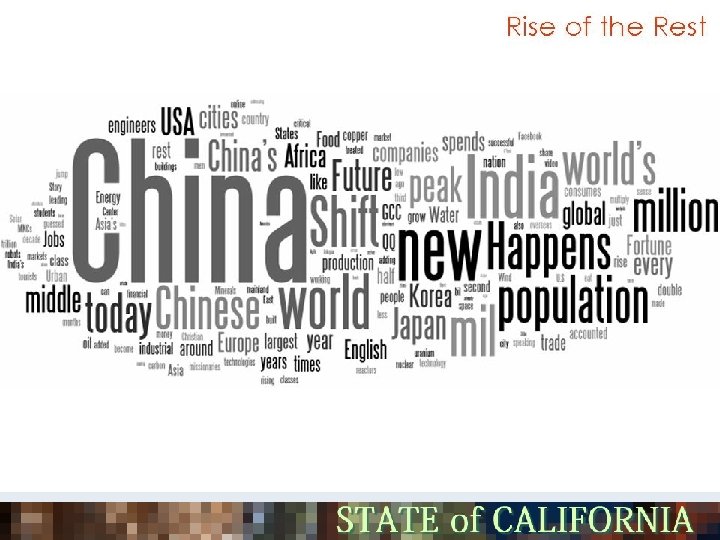 Competing Priorities § For every $100 spent by the CA Department of Education, only 15 cents goes to foreign language education. § No categorical funding allocated to World Languages Education § $110 Million - Visual and Performing Arts and Music Block Grant § $57 Million - Professional Development for Mathematics and Reading § $0 - World Languages