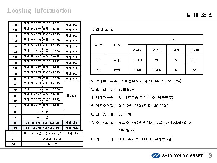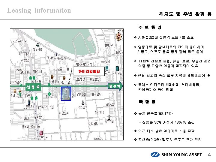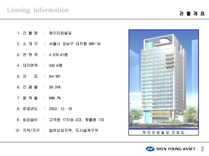 Leasing information 하이리빙 빌딩 SHIN YOUNG ASSET CO. , LTD. 서울시 강남구 삼성동 159 -1 아셈타워3층 ㈜신영에셋 SHIN YOUNG ASSET 1