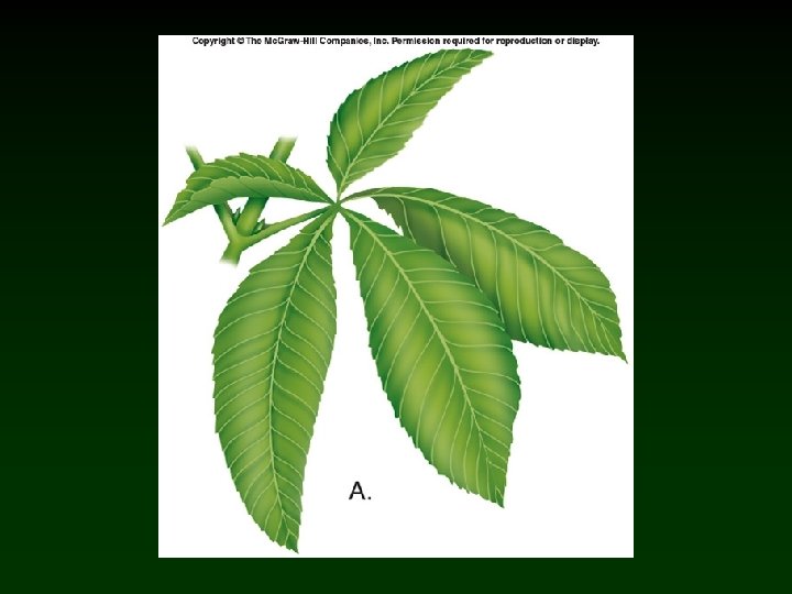 Leaf Arrangements and Types • Arrangement of veins in a leaf or leaflet blade may also be pinnate or palmate. v Pinnately veined leaves have a main midvein within a midrib. - Secondary veins branch from midvein. v Palmately veined leaves have several primary veins that fan out from the base of the blade. - Parallel in monocots - Divergent in dicots