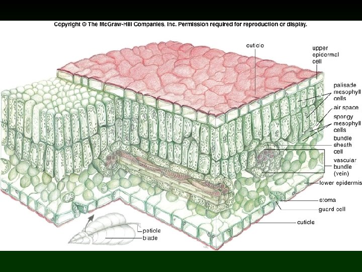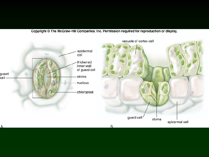Stomata • Lower epidermis of most plans is perforated by numerous stomata. v Guard cells originate from the same parent cell, and contain chloroplasts. - Primary function includes regulating gas exchange between leaf interior and the atmosphere, and the evaporation of water. Ø Cell water pressure regulates guard cells which in turn regulate stomata.