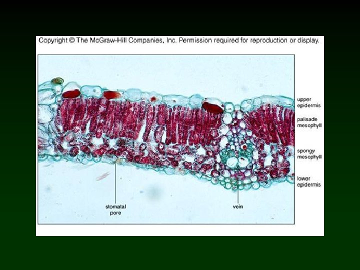 Mesophyll and Veins • • Most photosynthesis takes place in the mesophyll between the two epidermal layers. v Palisade Mesophyll - Uppermost layer Contain most of leaf’s chloroplasts. v Spongy Mesophyll - Lower layer Veins (Vascular bundles) are scattered throughout the mesophyll. v Consist of xylem and phloem tissues surrounded by the bundle sheath.