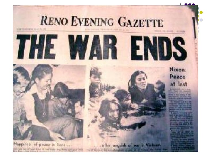 The Paris Peace Agreement l l l In early January 1973, the Nixon White House convinced Saigon that they would not abandon the South Vietnamese army if they signed the peace accord. On January 23, therefore, the final draft was initialed, ending open hostilities between the United States and North Vietnam. The Paris Peace Agreement did not end the conflict in Vietnam, however, as Saigon continued to battle Communist forces.