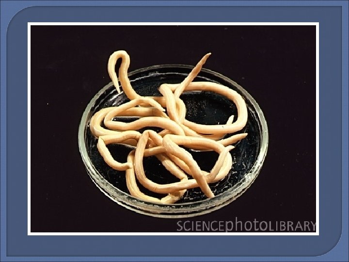 Nematoda - 2 Most roundworms are parasites and are found in all habitats. They have separate sexes generally and reproduce sexually. The roundworm Trichinella, causes the disease called trichinosis. People get trichinosis from eating infected, undercooked pork. All these worms reproduce by laying thousands of eggs, which become encysted in the grass and wait to be ingested. The most important agricultural species are: • Lungworms (Causes Hoose) • Hairworms (Worms in school children) • Potato eelworm • Stomach worms