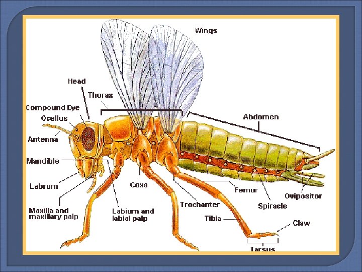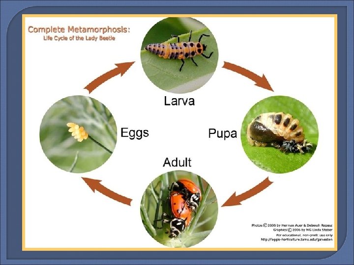 Arthropoda – Class Insecta They have three main body parts: Head, thorax and abdomen They include aphids, lice, fleas, crane-flies and butterflies. The life cycle of all insects follows this path: Egg Larvae Pupa Adult The larva is another name for a maggot and the pupa is a cocoon.