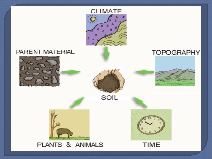 Parent rock/material All soils come from parent materials. Therefore the type of soil in an area depends on the parent rock. The condition of the soil is highly dependent on the type of bedrock. Example: • Soils formed from granite would be acidic (p. H < 7) • Soils from Limestone would be basic. Drainage depends on the underlying rock.