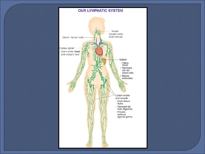 Functions of the Lymphatic System � The functions of the Lymphatic System are � Drainage – returns extra cellular (leaked) fluid to the blood � Transport – lipid (fats and oils) are absorbed from the small intestine and carried to the skin or other organs for storage. � Defence – filters blood. Germs that enter the blood or tissue fluid will pass through the lymph and lymph nodes, where WBC’s attack and destroy them. Swollen glands are actively fighting infection.