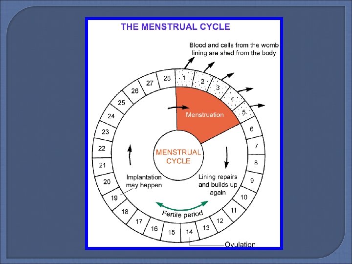 The Menstrual Cycle � The menstrual cycle is the repeating series of changes in the uterine lining of a fertile female if fertilisation and implantation does not happen. � This cycle ranges from 24 to 35 days, commonly 28 days.