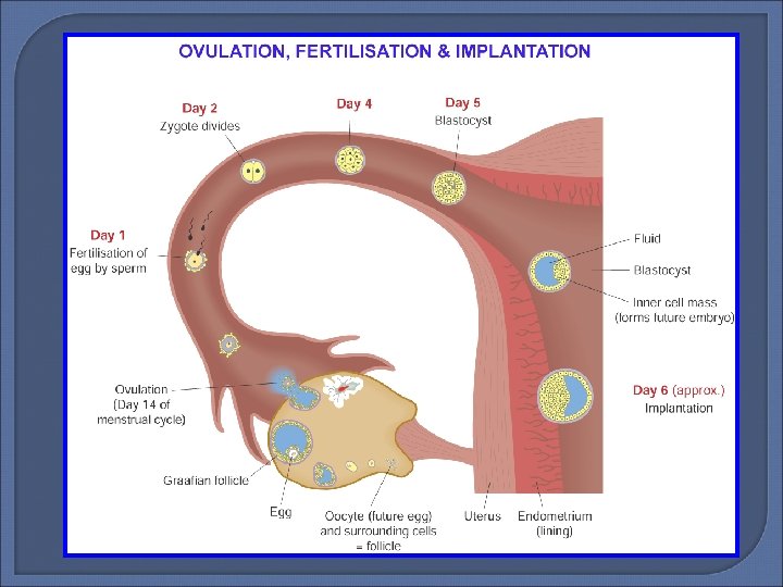 Pregnancy and Implantation � The usual first sign that pregnancy has occurred is that menstruation does not happen. � Implantation is the embedding of the blastocyst (early developing embryo) into the uterine lining (endometrium). � Implantation occurs about six days after fertilisation. � The developing embryo releases a hormone into the mother’s blood. � This hormone maintains the corpus luteum. � The surviving corpus luteum continues to secrete progesterone and oestrogen. � As a result the endometrium (uterine lining) does not break down and the pregnancy continues. � Conception is fertilisation followed by successful implantation.