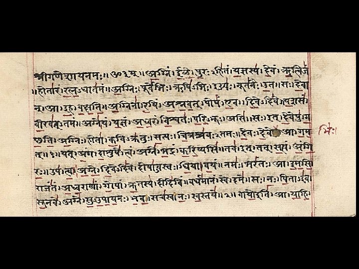 MANTRA • MANTRAS are very closely linked with the most important Hindu SACRED TEXTS – the VEDAS – and the language of their composition: SANSKRIT. • VEDA means KNOWLEDGE. • Acceptance of the authority of the VEDAS is probably one of the only widely agreed criteria for being Hindu. • The Vedas were transmitted orally for many centuries (or millennia) until they were finally committed to writing in the 2 nd century BCE. • Most Hindus believe that these texts were ‘heard’ (SHRUTI) BY SAGES (RISHIS) – not actually composed them (a type of revelation)