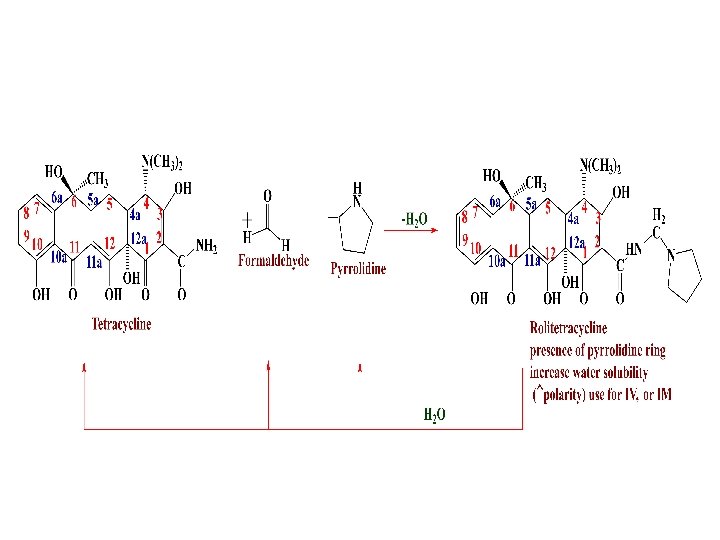 Rolitetracycline This approach was also used with the antibiotic tetracycline—the amide nitrogen was allowed to react with formaldehyde and pyrrolidine to give the Mannich base rolitetracycline. In this case, addition of the basic pyrrolidine nitrogen introduces an additional ionizable functionality and increases the water solubility of the parent drug. The Mannich base hydrolyzes completely and rapidly in aqueous media to give the active tetracycline.