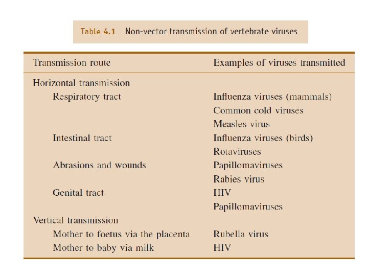 § In order not to die out, viruses must be propagated and transmitted to new hosts in which more virions can be produced. The only other way for the survival of virus genes is to be maintained as in cells as nucleic acids, which are replicated and passed on to daughter cells when the cells divide. § Viruses of bacteria and other microbial hosts are released from infected cell into the environment of the host to find more susceptible cells that are likely to be present. § Viruses of multicellular animals and plants must also find new cells to infect. An infection may spread from cell to cell, or to cell in adjacent part of the host after transport in the blood of an animal or in the phloem of a plant. Ultimately a virus must find new host to infect in order to survive. • Transmission via vectors: general concept Many viruses are transmitted between hosts by organisms that feed on them. These organisms act as vectors. Most vectors of viruses are arthropods (insects, mites, ticks). The arthropod-transmitted viruses of vertebrates are sometimes referred to as arboviruses (arthropod-born viruses).