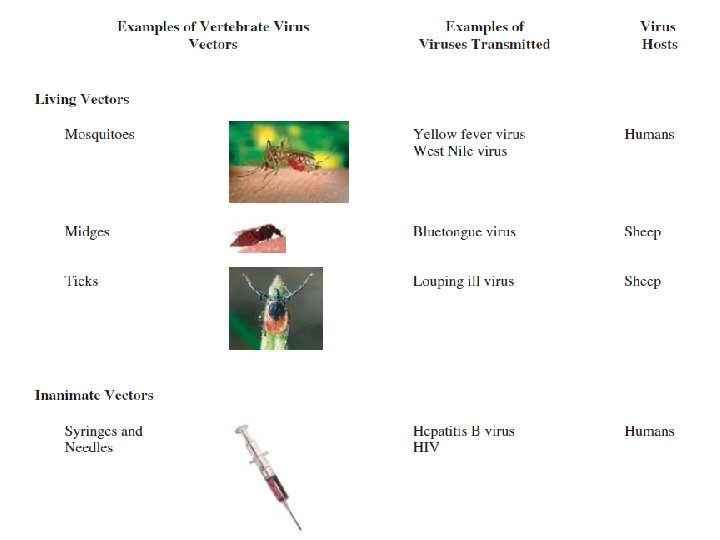 2. Vector transmission of vertebrate viruses Vector that acquire their viruses when they take blood meals from infected animals. Obviously for this to occur virus must be present in the blood of infected animalsectors that transmit vertebrate viruses are mainly blood-feeding arthropods, a situation known as viraemia. Some arthropod parasites that acquire virus infections from the vertebrates on which they feed remain infected for life. This is the case with ticks that become infected with tick-borne encephalitis virus. Transovarial transmission has been demonstrated for a number of viruses, including yellow fever virus in mosquitoes. Viruses in blood or blood products can be transmitted during medical procedures by inanimate ‘vectors’ such as blood transfusion equipment and syringes and needles. Viruses can also be transmitted when needles for drug injection are shared, when needlestick injuries occur and when hemophiliacs are injected with blood factors containing viruses.