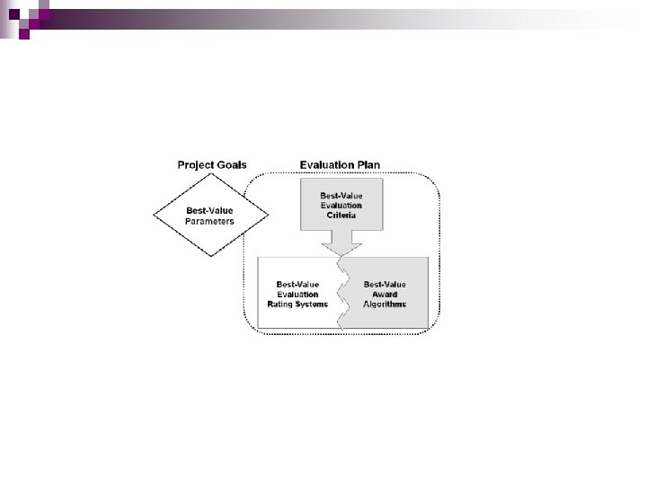 Best Value Procurement n n Best-Value Procurement—a procurement process where price and other key factors are considered in the evaluation and selection process to minimize impacts and enhance the long-term performance and value of construction. These primary concepts are: Parameters, ¨ Evaluation criteria, ¨ Rating systems, and ¨ Award algorithms. ¨ n n Where: x = weighting A = Cost, B = Time , P = Performance and Qualifications Q = Quality Management, D = Design Alternates