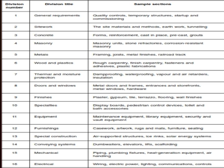 Technical specifications • They contain the detailed technical provisions related to installation or construction of the several portions of the work and the materials incorporated therein • It is common practice to refer in the technical specifications to codes and standards developed by industry associations, rather than to repeat those standards in the specifications themselves. • For Example ACI-318 Testing Fresh Concrete, which is a European standard test method developed by ACI • If this reference is part of the concrete technical specifications, the contractor will be obligated to follow its provisions for such practices as sampling, slump tests and air content testing, even though the requirements are not contained directly within the specifications.