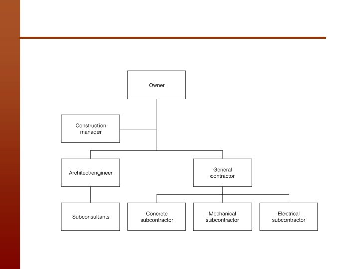 • Project manager • Adding a project manager between the owner and the architect/engineer and general contractor • This arrangement implies that the project manager contracts with the designer and the general contractor.